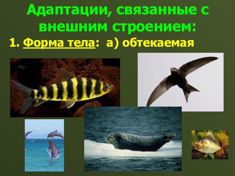 Адаптации, связанные с внешним строением:1. Форма тела: а) обтекаемая