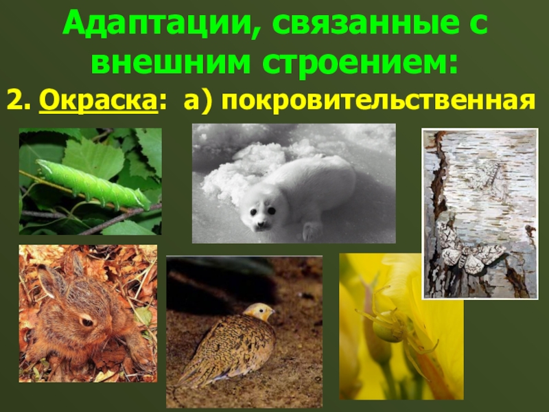 Адаптации, связанные с внешним строением:2. Окраска: а) покровительственная