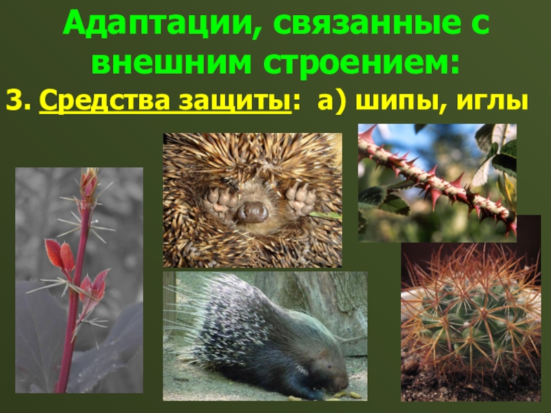 Адаптации, связанные с внешним строением:3. Средства защиты: а) шипы, иглы