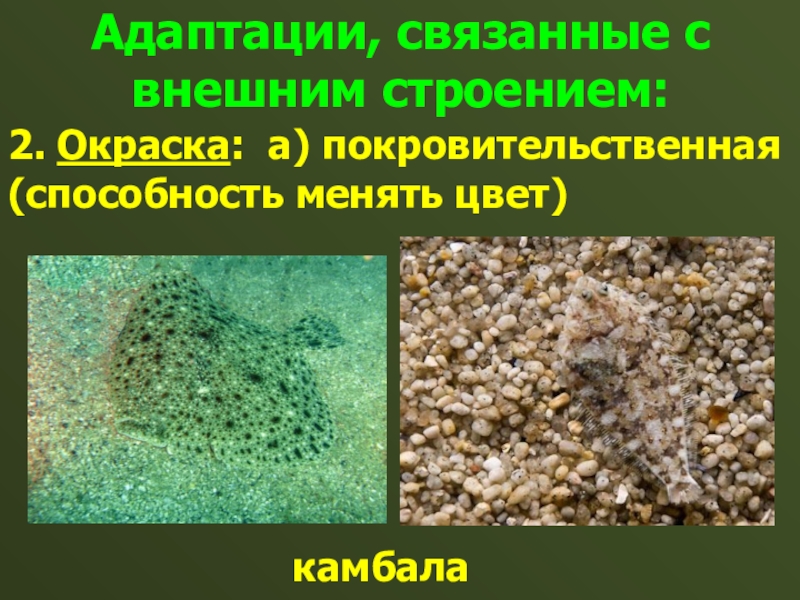 Адаптации, связанные с внешним строением:2. Окраска: а) покровительственная(способность менять цвет)камбала