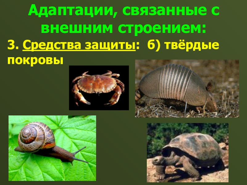 Адаптации, связанные с внешним строением:3. Средства защиты: б) твёрдые покровы