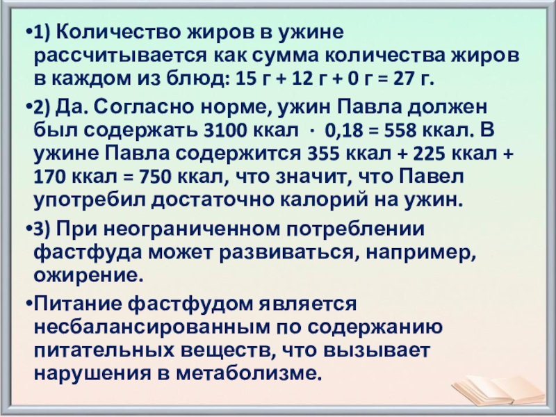 2) Да. Согласно норме, ужин Павла должен был содержать 3100 ккал · 0,18 = 558 ккал. В ужине Павла содержится 355 ккал + 225 ккал + 170 ккал = 750 ккал, что значит, что Павел употребил достаточно калорий на ужин.