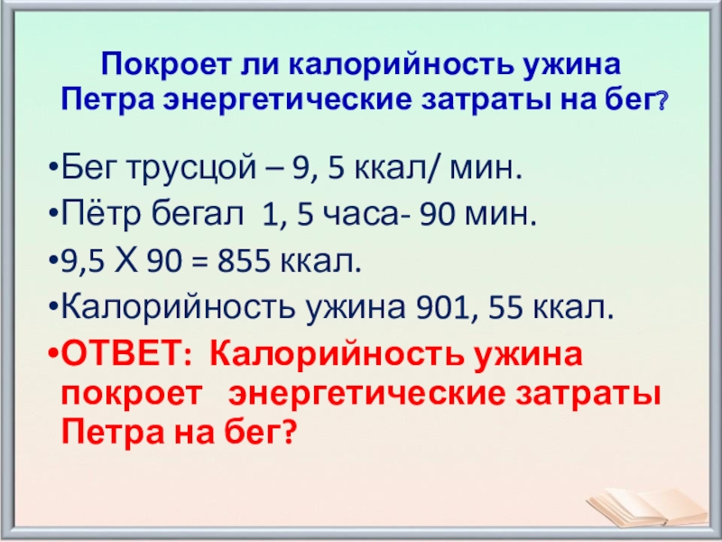 ОТВЕТ: Калорийность ужина покроет энергетические затраты Петра на бег?