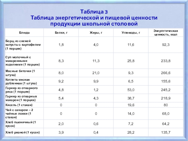 Таблица энергетической и пищевой ценности продукции школьной столовой