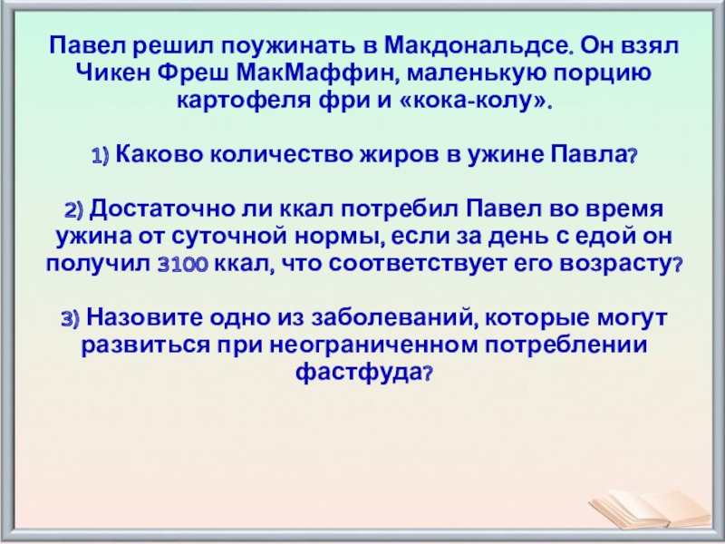 Слайд 18Павел решил поужинать в Макдональдсе. Он взял Чикен Фреш МакМаффин, маленькую
