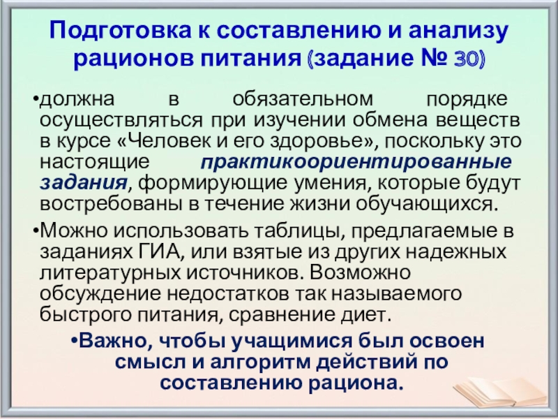 Слайд 4Подготовка к составлению и анализу рационов питания (задание № 30)