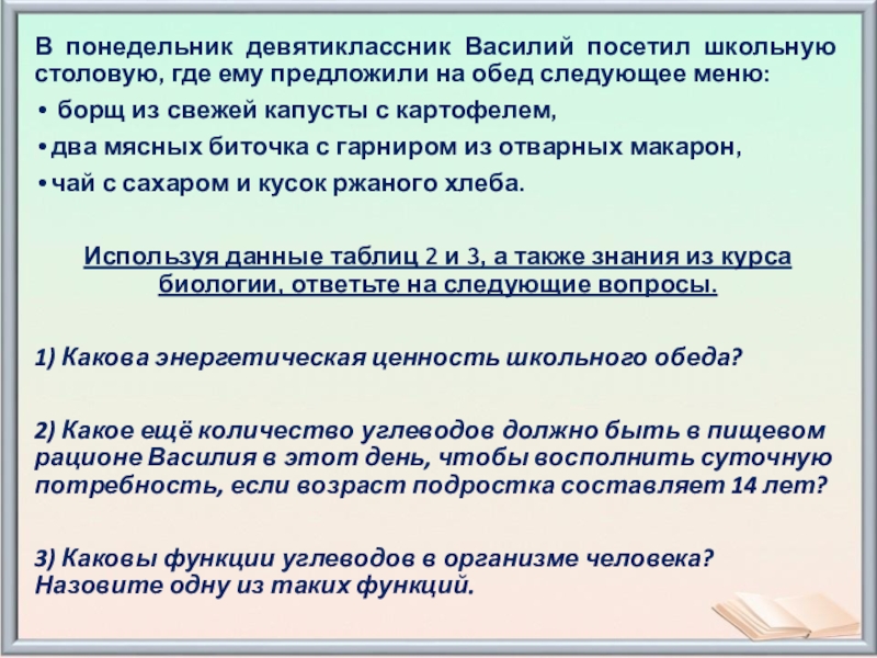 Слайд 6В понедельник девятиклассник Василий посетил школьную столовую, где ему предложили на