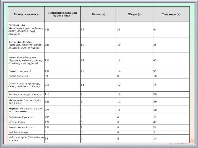 Можно использовать таблицы, предлагаемые в заданиях ГИА, или взятые из других надежных литературных источников. Возможно обсуждение недостатков так называемого быстрого питания, сравнение диет.
