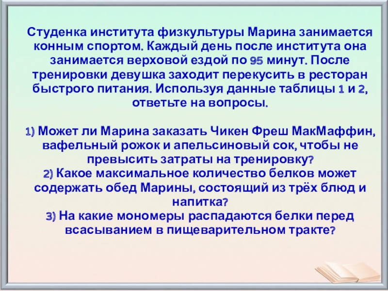 она занимается верховой ездой по 95 минут. После тренировки девушка заходит перекусить в ресторан быстрого питания. Используя данные таблицы 1 и 2, ответьте на вопросы.