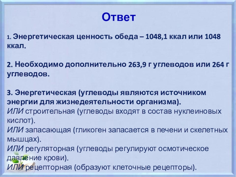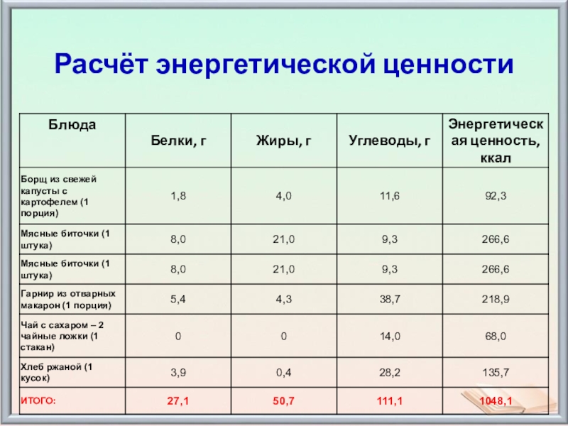 1. Энергетическая ценность обеда – 1048,1 ккал или 1048 ккал.