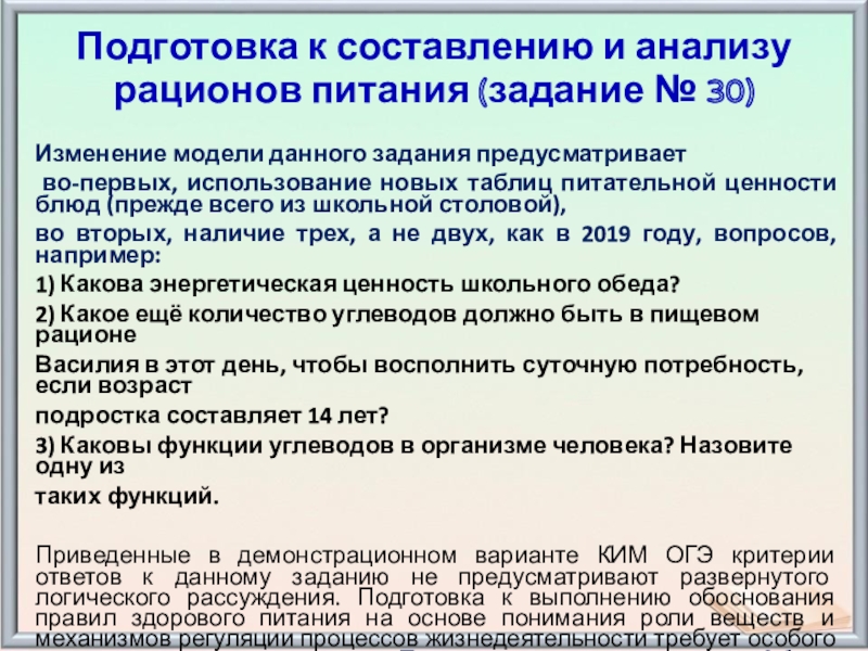 Приведенные в демонстрационном варианте КИМ ОГЭ критерии ответов к данному заданию не предусматривают развернутого логического рассуждения. Подготовка к выполнению обоснования правил здорового питания на основе понимания роли веществ и механизмов регуляции процессов жизнедеятельности требует особого внимания при изучении тем «Питание и пищеварение», «Обмен веществ», «Нейро-гуморальная регуляция».