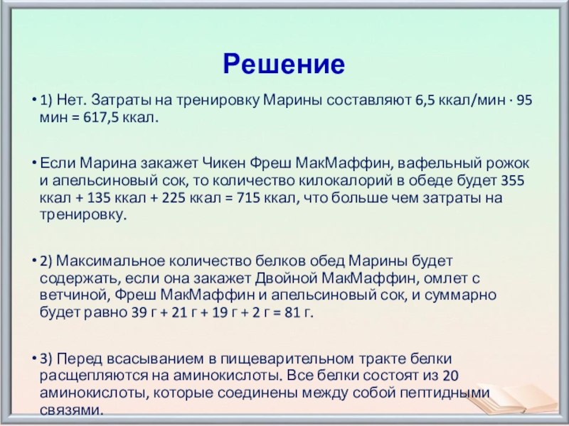 Если Марина закажет Чикен Фреш МакМаффин, вафельный рожок и апельсиновый сок, то количество килокалорий в обеде будет 355 ккал + 135 ккал + 225 ккал = 715 ккал, что больше чем затраты на тренировку.