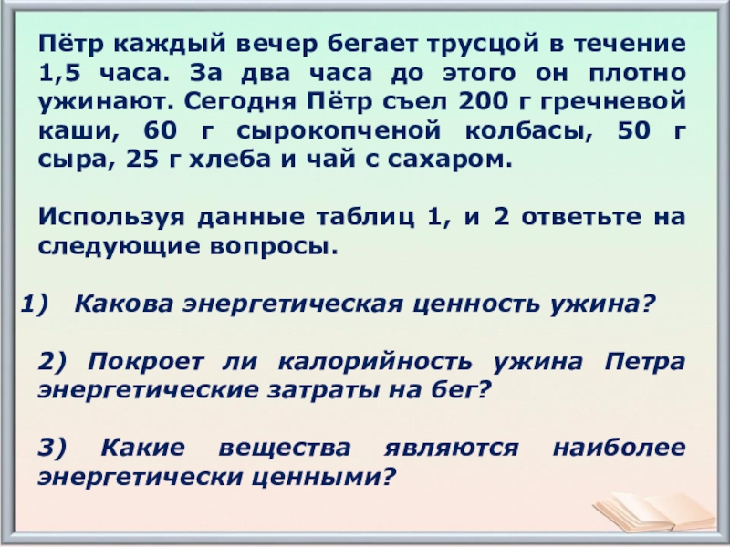 Слайд 16Покроет ли калорийность ужина Петра энергетические затраты на бег?