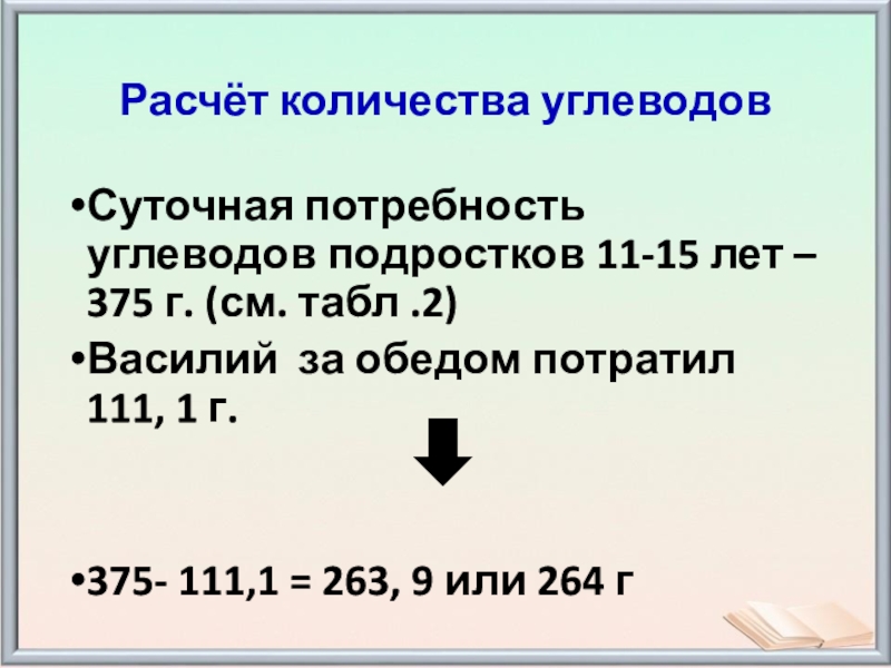 2) Какое ещё количество углеводов должно быть в пищевом рационе Василия в этот день, чтобы восполнить суточную потребность, если возраст подростка составляет 14 лет?