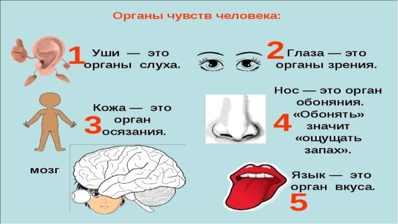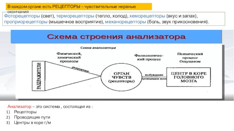 Фоторецепторы (свет), терморецепторы (тепло, холод), хеморецепторы (вкус и запах), проприорецепторы (мышечное восприятие), механорецепторы (боль, звук прикосновения).