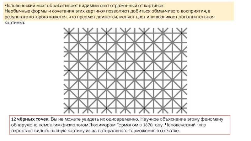 12 чёрных точек. Вы не можете увидеть их одновременно. Научное объяснение этому феномену обнаружено немецким физиологом Людимаром Германом в 1870 году. Человеческий глаз перестает видеть полную картину из-за латерального торможения в сетчатке.