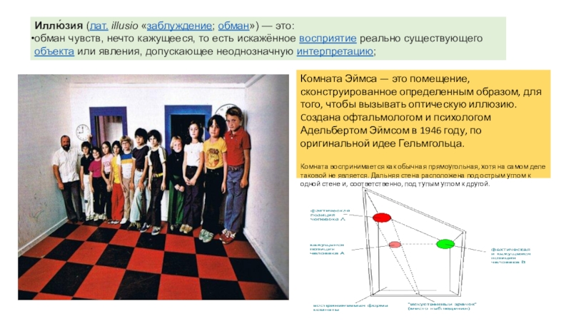 Комната Эймса — это помещение, сконструированное определенным образом, для того, чтобы вызывать оптическую иллюзию. Cоздана офтальмологом и психологом Адельбертом Эймсом в 1946 году, по оригинальной идее Гельмгольца.