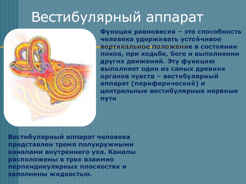 Вестибулярный аппарат человека представлен тремя полукружными каналами внутреннего уха. Каналы расположены в трех взаимно перпендикулярных плоскостях и заполнены жидкостью.
