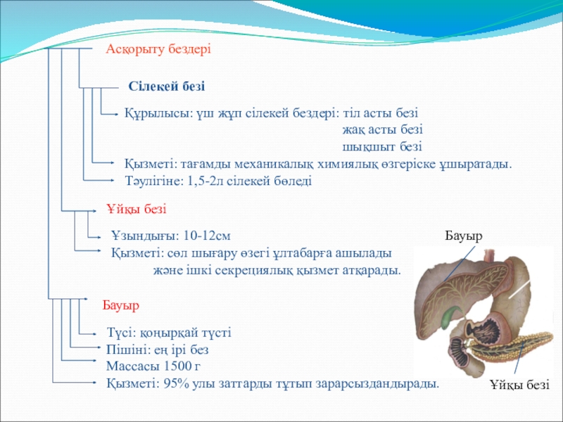 Құрылысы: үш жұп сілекей бездері: тіл асты безі