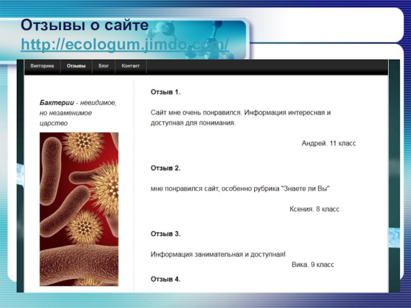 Слайд 20Отзывы о сайте http://ecologum.jimdo.com/
