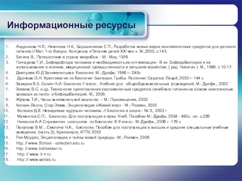 Зимина В.С. и др. Технология приготовления кисломолочных продуктов лечебного питания на основе комплексных заквасок из лакто- и бифидобактерий. М., 2006.