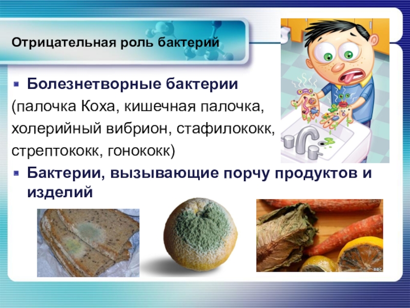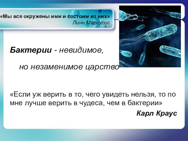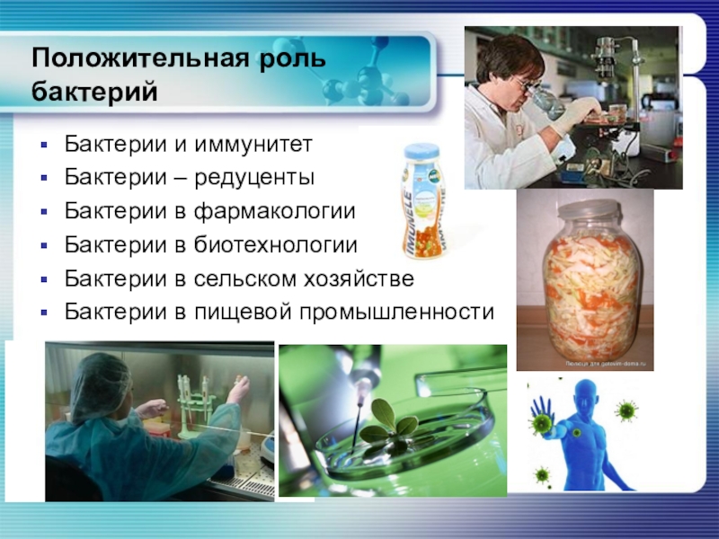 Актуальность: человек встречается с бактериями на каждом шагу. Но не все знают, какие бактерии приносят вред, а какие пользу, и что нужно делать, чтобы избежать действие болезнетворных бактерий, чтобы не заболеть. В наши дни люди научились использовать деятельность бактерий в промышленности, в фармакологии, в продуктах питания и в других сферах деятельности человека. Опасно ли это, и какие могут быть последствия?