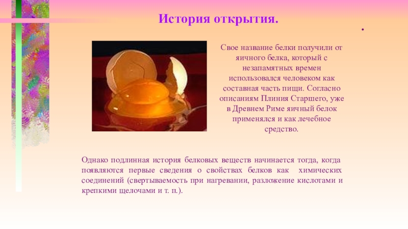 Однако подлинная история белковых веществ начинается тогда, когда появляются первые сведения о свойствах белков как химических соединений (свертываемость при нагревании, разложение кислотами и крепкими щелочами и т. п.).