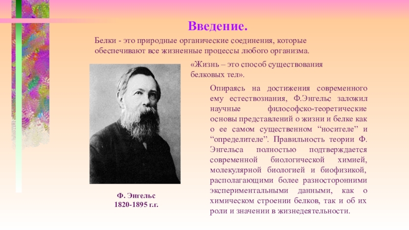 Опираясь на достижения современного ему естествознания, Ф.Энгельс заложил научные философско-теоретические основы представлений о жизни и белке как о ее самом существенном “носителе” и “определителе”. Правильность теории Ф.Энгельса полностью подтверждается современной биологической химией, молекулярной биологией и биофизикой, располагающими более разносторонними экспериментальными данными, как о химическом строении белков, так и об их роли и значении в жизнедеятельности.