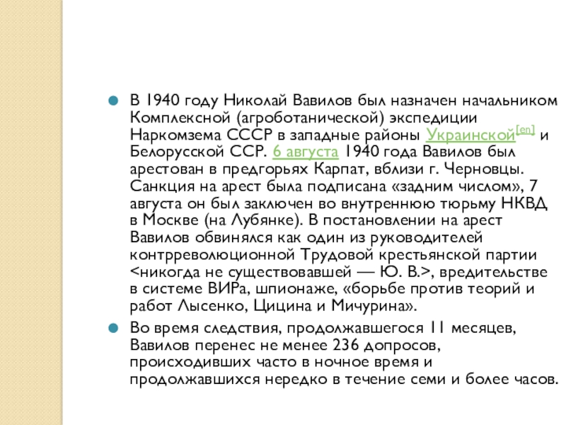 Наркомзема СССР в западные районы Украинской[en] и Белорусской ССР. 6 августа 1940 года Вавилов был арестован в предгорьях Карпат, вблизи г. Черновцы. Санкция на арест была подписана «задним числом», 7 августа он был заключен во внутреннюю тюрьму НКВД в Москве (на Лубянке). В постановлении на арест Вавилов обвинялся как один из руководителей контрреволюционной Трудовой крестьянской партии <никогда не существовавшей — Ю. В.>, вредительстве в системе ВИРа, шпионаже, «борьбе против теорий и работ Лысенко, Цицина и Мичурина».