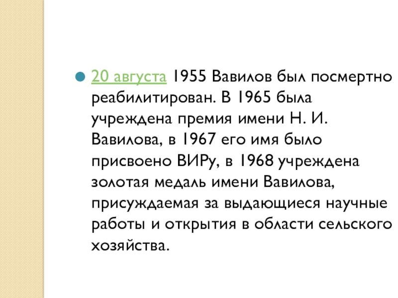 Слайд 2220 августа 1955 Вавилов был посмертно реабилитирован. В 1965 была учреждена премия