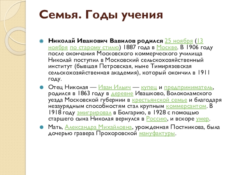 Николай Иванович Вавилов родился 25 ноября (13 ноября по старому стилю) 1887