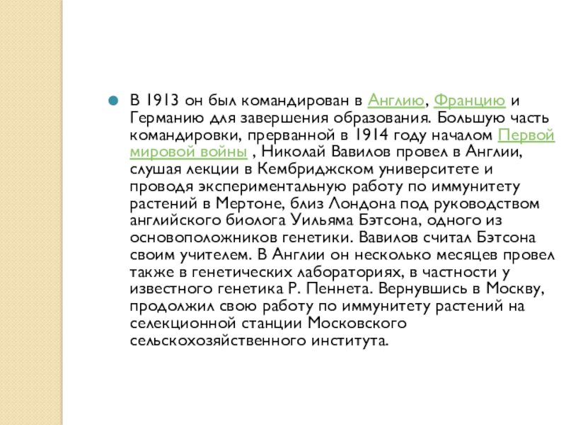 часть командировки, прерванной в 1914 году началом Первой мировой войны , Николай Вавилов провел в Англии, слушая лекции в Кембриджском университете и проводя экспериментальную работу по иммунитету растений в Мертоне, близ Лондона под руководством английского биолога Уильяма Бэтсона, одного из основоположников генетики. Вавилов считал Бэтсона своим учителем. В Англии он несколько месяцев провел также в генетических лабораториях, в частности у известного генетика Р. Пеннета. Вернувшись в Москву, продолжил свою работу по иммунитету растений на селекционной станции Московского сельскохозяйственного института.