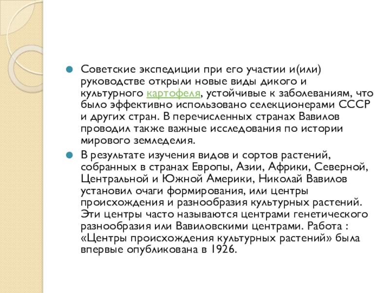 и культурного картофеля, устойчивые к заболеваниям, что было эффективно использовано селекционерами СССР и других стран. В перечисленных странах Вавилов проводил также важные исследования по истории мирового земледелия.