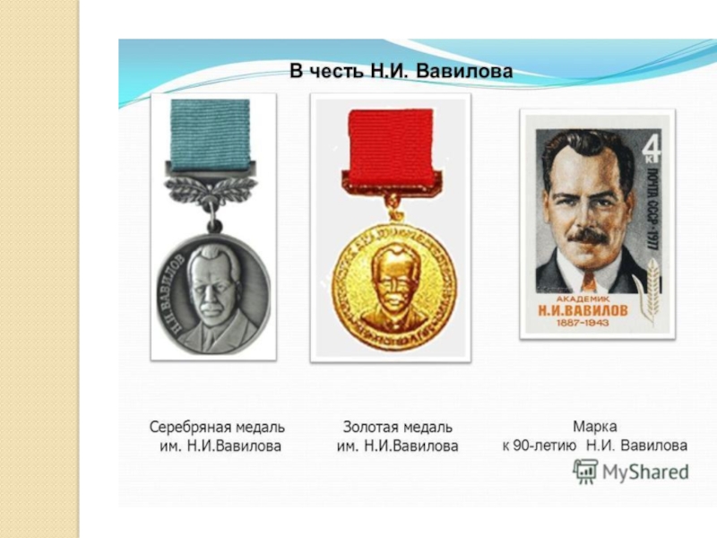 имени Н. И. Вавилова, в 1967 его имя было присвоено ВИРу, в 1968 учреждена золотая медаль имени Вавилова, присуждаемая за выдающиеся научные работы и открытия в области сельского хозяйства.