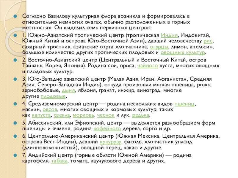 Слайд 12Согласно Вавилову культурная флора возникла и формировалась в относительно немногих очагах,