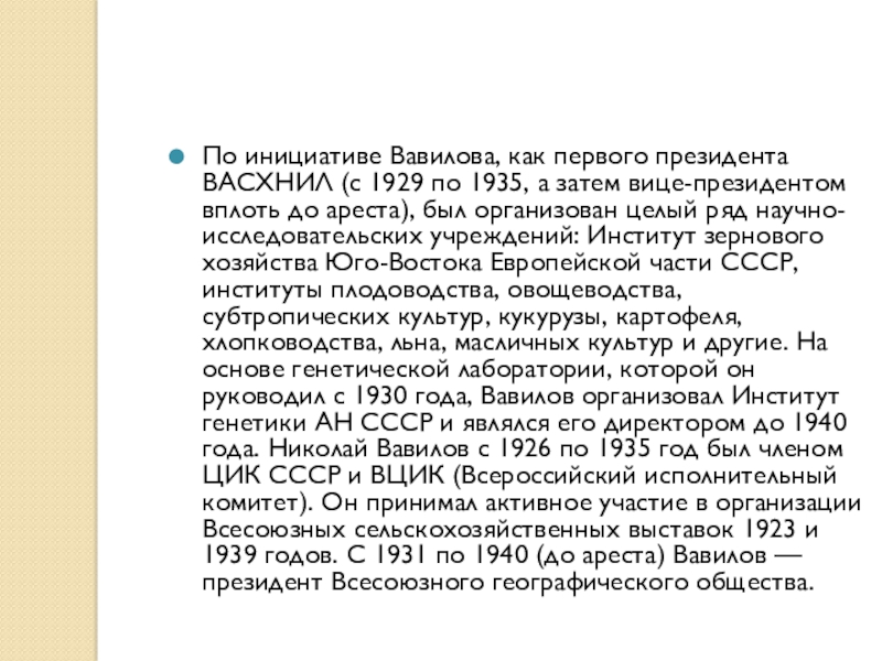 а затем вице-президентом вплоть до ареста), был организован целый ряд научно-исследовательских учреждений: Институт зернового хозяйства Юго-Востока Европейской части СССР, институты плодоводства, овощеводства, субтропических культур, кукурузы, картофеля, хлопководства, льна, масличных культур и другие. На основе генетической лаборатории, которой он руководил с 1930 года, Вавилов организовал Институт генетики АН СССР и являлся его директором до 1940 года. Николай Вавилов с 1926 по 1935 год был членом ЦИК СССР и ВЦИК (Всероссийский исполнительный комитет). Он принимал активное участие в организации Всесоюзных сельскохозяйственных выставок 1923 и 1939 годов. С 1931 по 1940 (до ареста) Вавилов — президент Всесоюзного географического общества.