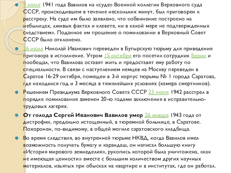 Слайд 219 июля 1941 года Вавилов на «суде» Военной коллегии Верховного суда СССР,