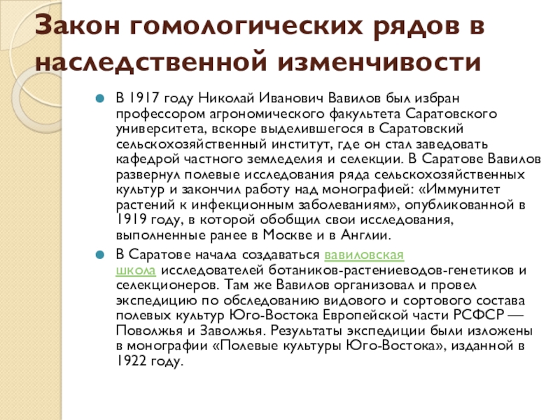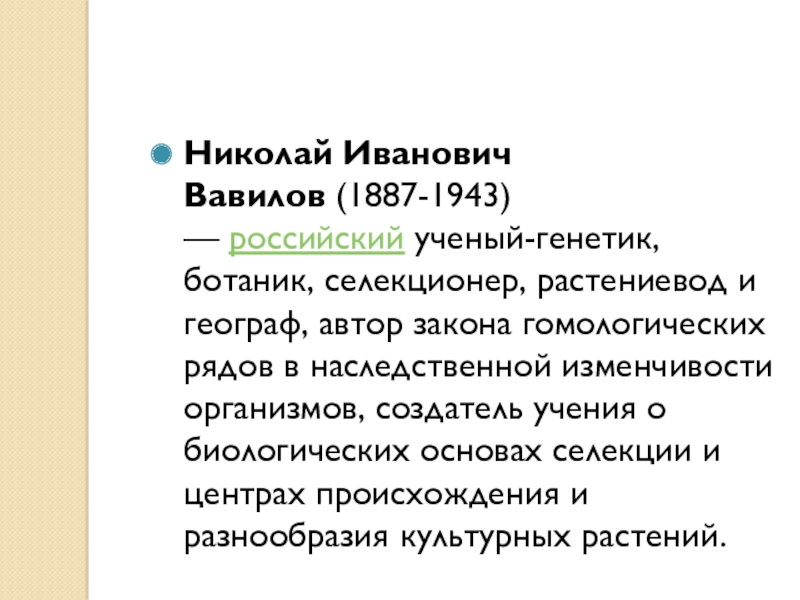 гомологических рядов в наследственной изменчивости организмов, создатель учения о биологических основах селекции и центрах происхождения и разнообразия культурных растений.