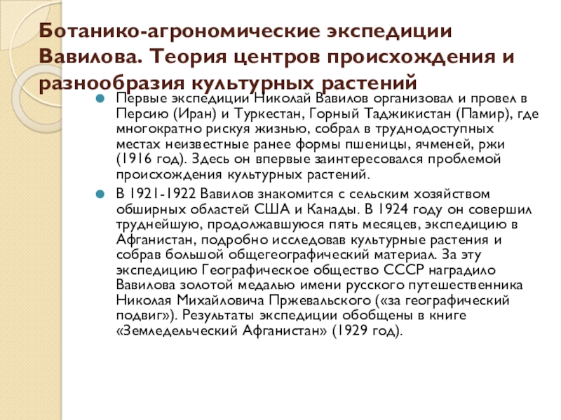 Слайд 9Ботанико-агрономические экспедиции Вавилова. Теория центров происхождения и разнообразия культурных растений