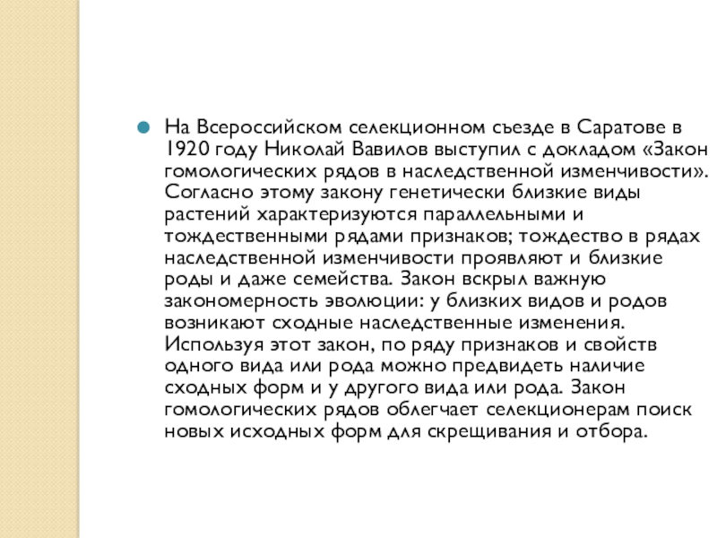 выступил с докладом «Закон гомологических рядов в наследственной изменчивости». Согласно этому закону генетически близкие виды растений характеризуются параллельными и тождественными рядами признаков; тождество в рядах наследственной изменчивости проявляют и близкие роды и даже семейства. Закон вскрыл важную закономерность эволюции: у близких видов и родов возникают сходные наследственные изменения. Используя этот закон, по ряду признаков и свойств одного вида или рода можно предвидеть наличие сходных форм и у другого вида или рода. Закон гомологических рядов облегчает селекционерам поиск новых исходных форм для скрещивания и отбора.