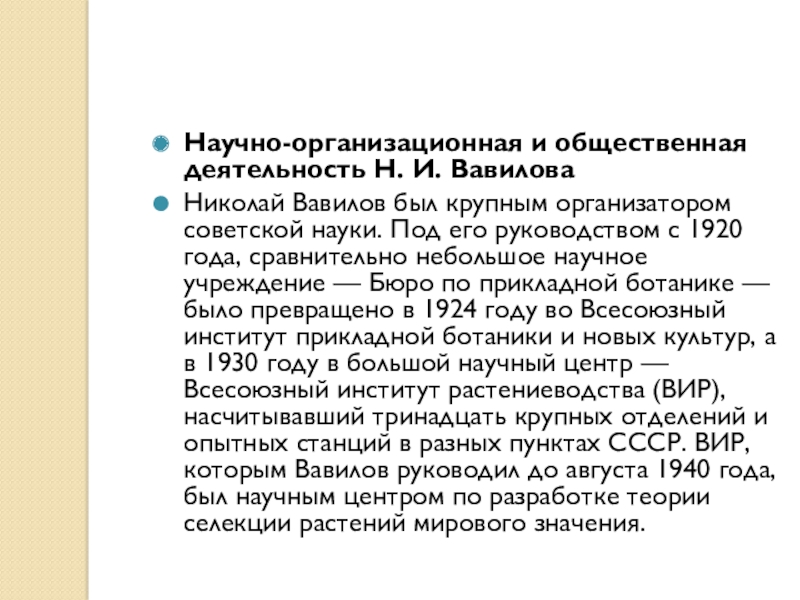 советской науки. Под его руководством с 1920 года, сравнительно небольшое научное учреждение — Бюро по прикладной ботанике — было превращено в 1924 году во Всесоюзный институт прикладной ботаники и новых культур, а в 1930 году в большой научный центр — Всесоюзный институт растениеводства (ВИР), насчитывавший тринадцать крупных отделений и опытных станций в разных пунктах СССР. ВИР, которым Вавилов руководил до августа 1940 года, был научным центром по разработке теории селекции растений мирового значения.