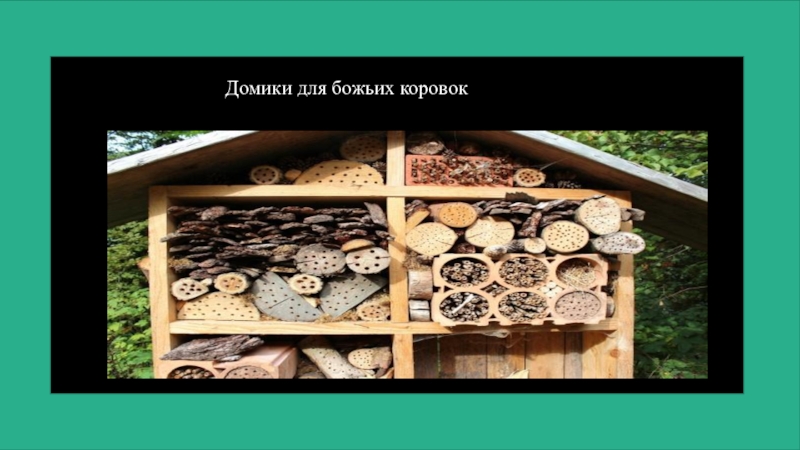 листоблошками. Остается только создать подходящие условия для жизни и размножения божьих коровок в наших садах и эти полезные насекомые останутся здесь на постоянное жительство. Личинки божьей коровки, появляющиеся из яиц, съедают по 100-150 тлей в день, а размножаются божьи коровки быстро. Домики для божьих коровок сделаны из древесных поленьев, из которых вынута середина. Такие поленья наполняют натуральными материалами, а крыша домика снимается для уборки домика или наблюдения за насекомыми. Домики для божьих коровок можно сделать и самим, просверлив отверстия в старом полене. Размещайте домики для божьих коровок в теплом и защищенном от ветра месте сада, желательно неподалеку от растений, подверженных нападению тли.