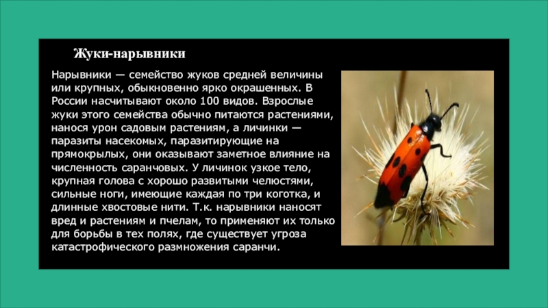 окрашенных. В России насчитывают около 100 видов. Взрослые жуки этого семейства обычно питаются растениями, нанося урон садовым растениям, а личинки — паразиты насекомых, паразитирующие на прямокрылых, они оказывают заметное влияние на численность саранчовых. У личинок узкое тело, крупная голова с хорошо развитыми челюстями, сильные ноги, имеющие каждая по три коготка, и длинные хвостовые нити. Т.к. нарывники наносят вред и растениям и пчелам, то применяют их только для борьбы в тех полях, где существует угроза катастрофического размножения саранчи.