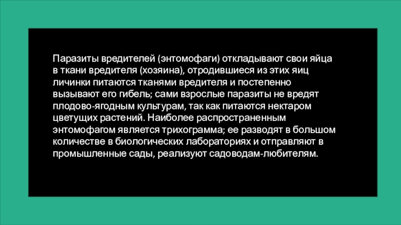 Слайд 3Паразиты вредителей (энтомофаги) откладывают свои яйца в ткани вредителя (хозяина), отродившиеся