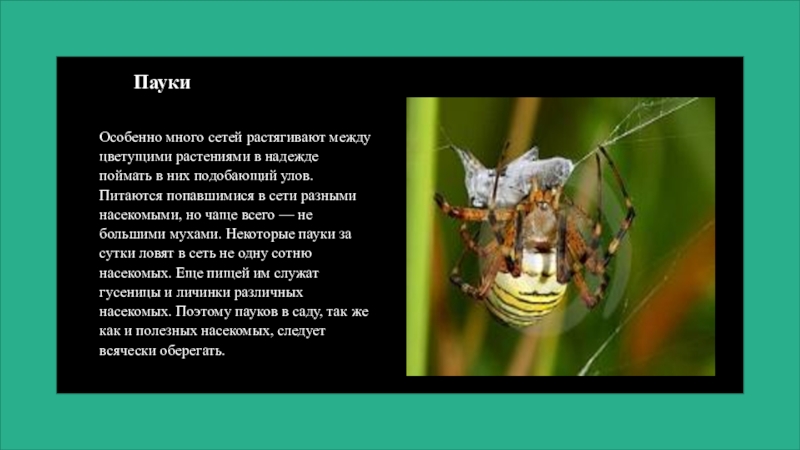 них подобающий улов. Питаются попавшимися в сети разными насекомыми, но чаще всего — небольшими мухами. Некоторые пауки за сутки ловят в сеть не одну сотню насекомых. Еще пищей им служат гусеницы и личинки различных насекомых. Поэтому пауков в саду, так же как и полезных насекомых, следует всячески оберегать.