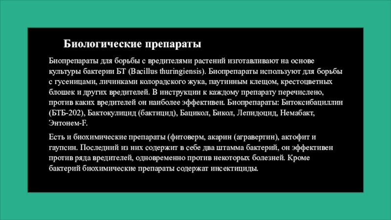 бактерии БТ (Bacillus thuringiensis). Биопрепараты используют для борьбы с гусеницами, личинками колорадского жука, паутинным клещом, крестоцветных блошек и других вредителей. В инструкции к каждому препарату перечислено, против каких вредителей он наиболее эффективен. Биопрепараты: Битоксибациллин (БТБ-202), Бактокулицид (бактицид), Бацикол, Бикол, Лепидоцид, Немабакт, Энтонем-F.