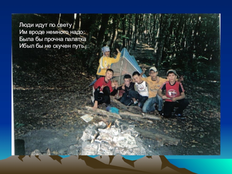 Люди идут по светуИм вроде немного надо:Была бы прочна палаткаИбыл бы не скучен путь…