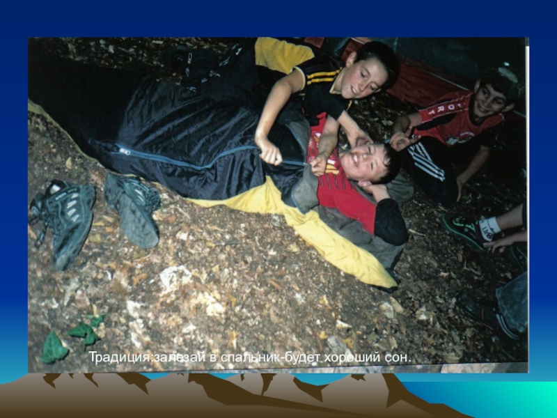 Слайд 10Традиция:залезай в спальник-будет хороший сон.