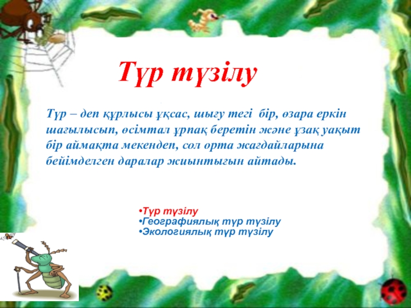 Түр – деп құрлысы ұқсас, шығу тегі бір, өзара еркін шағылысып, өсімтал ұрпақ беретін және ұзақ уақыт бір аймақта мекендеп, сол орта жағдайларына бейімделген даралар жиынтығын айтады.