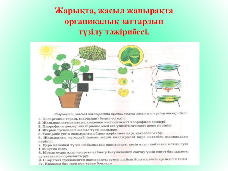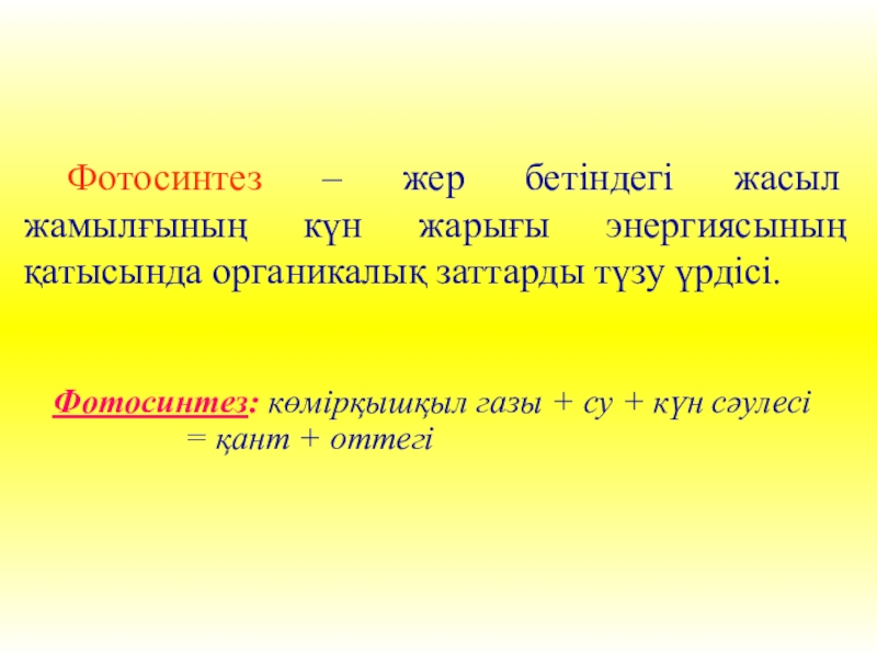Фотосинтез: көмірқышқыл газы + су + күн сәулесі = қант + оттегі